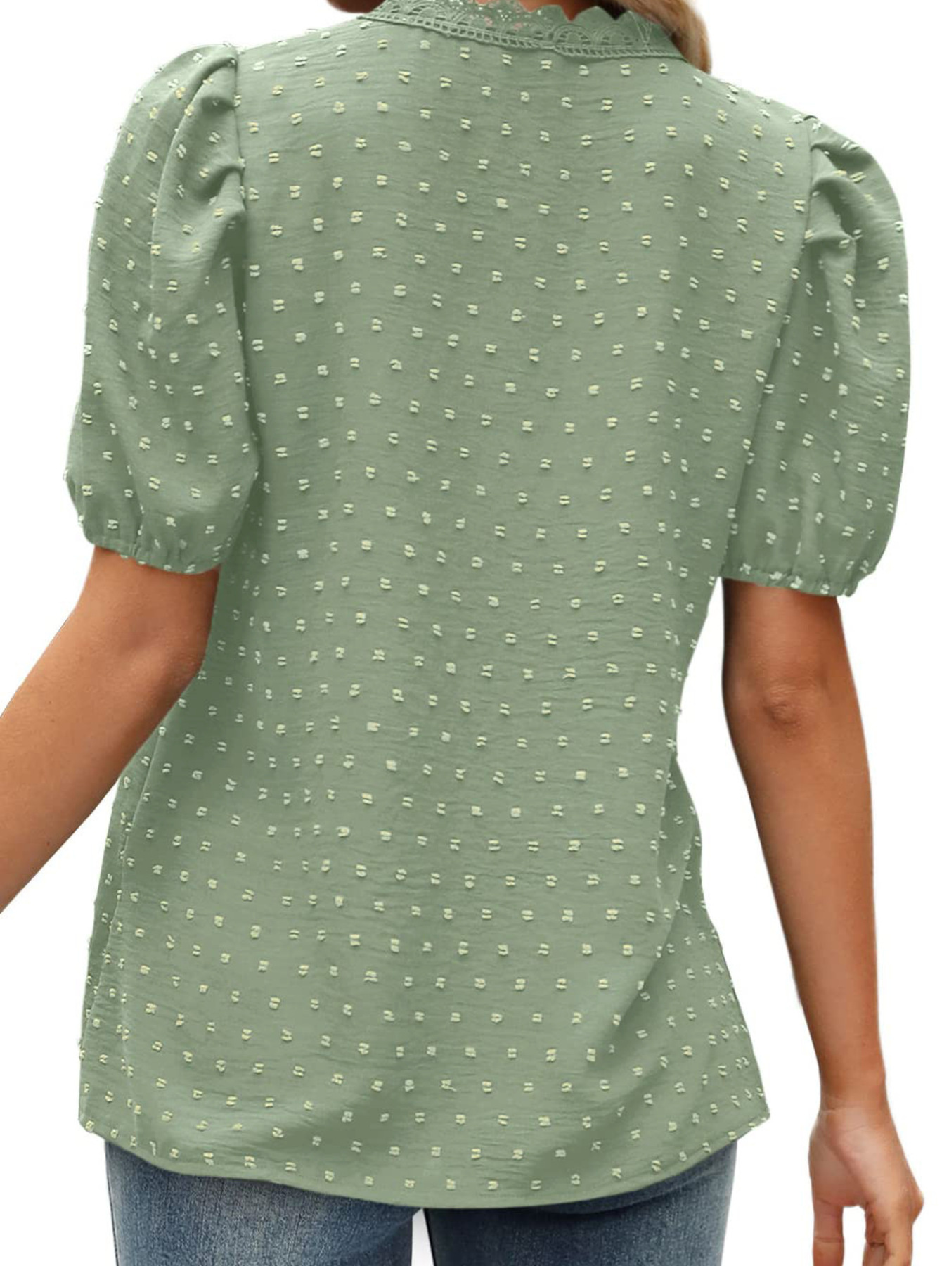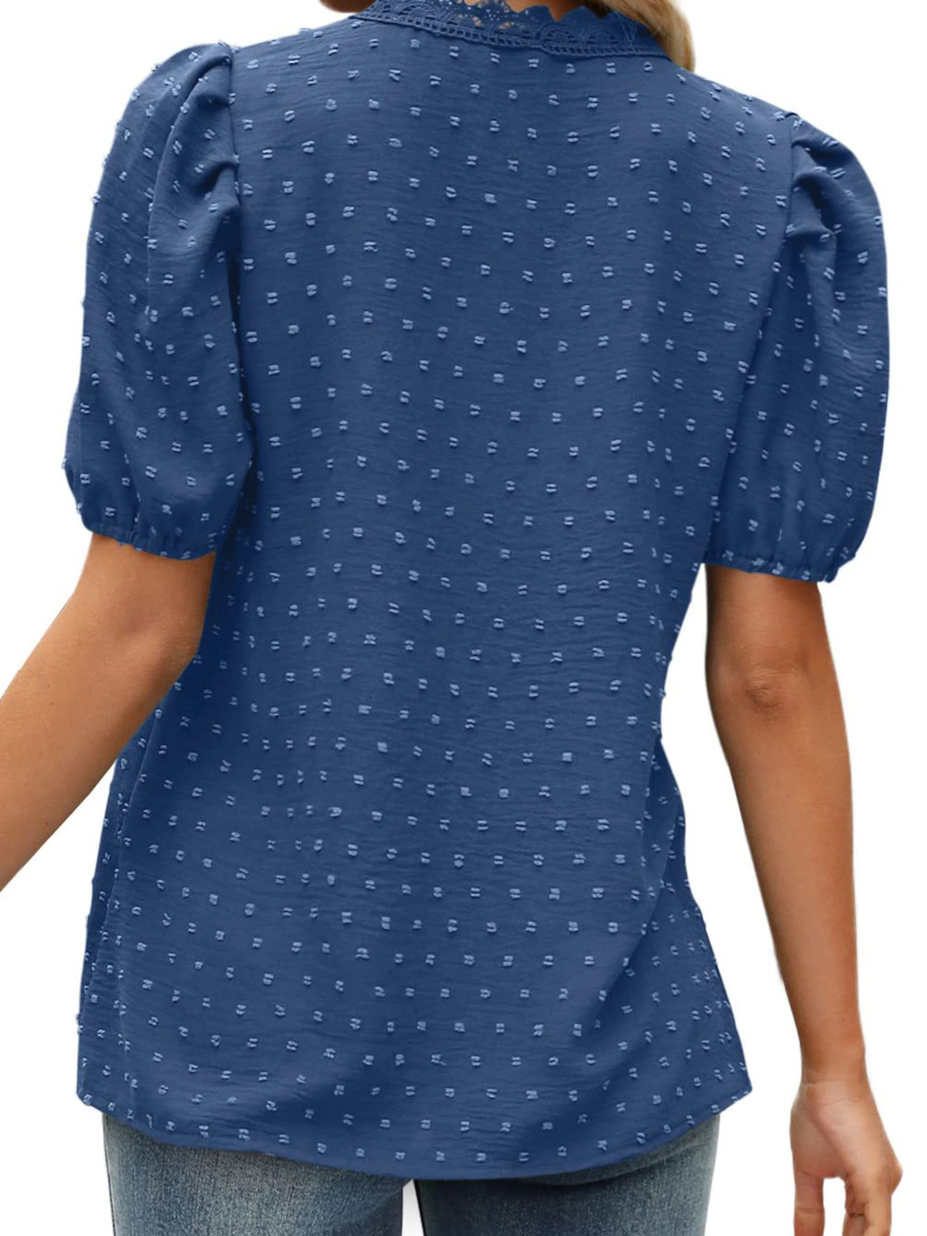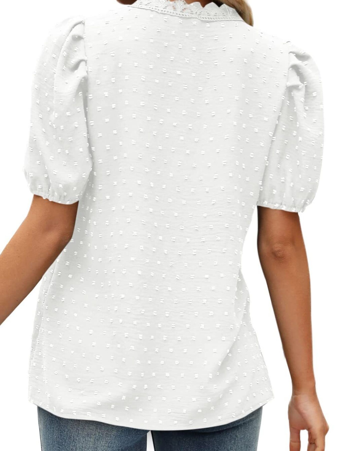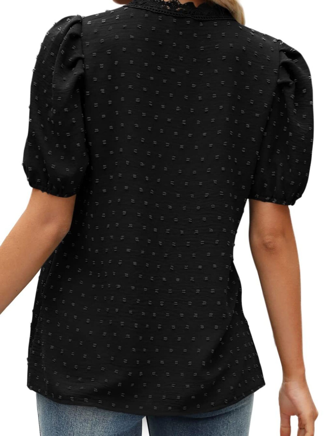 Puff Sleeve Swiss Dot Lace Trim Blouse