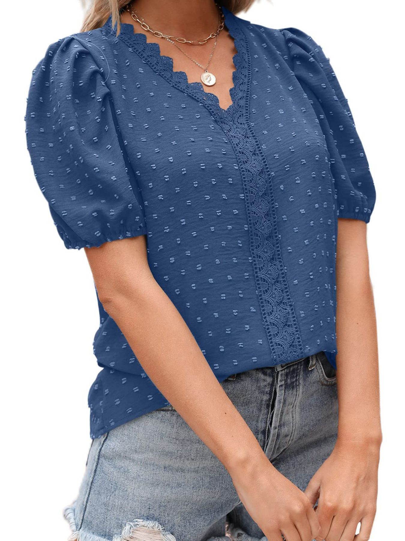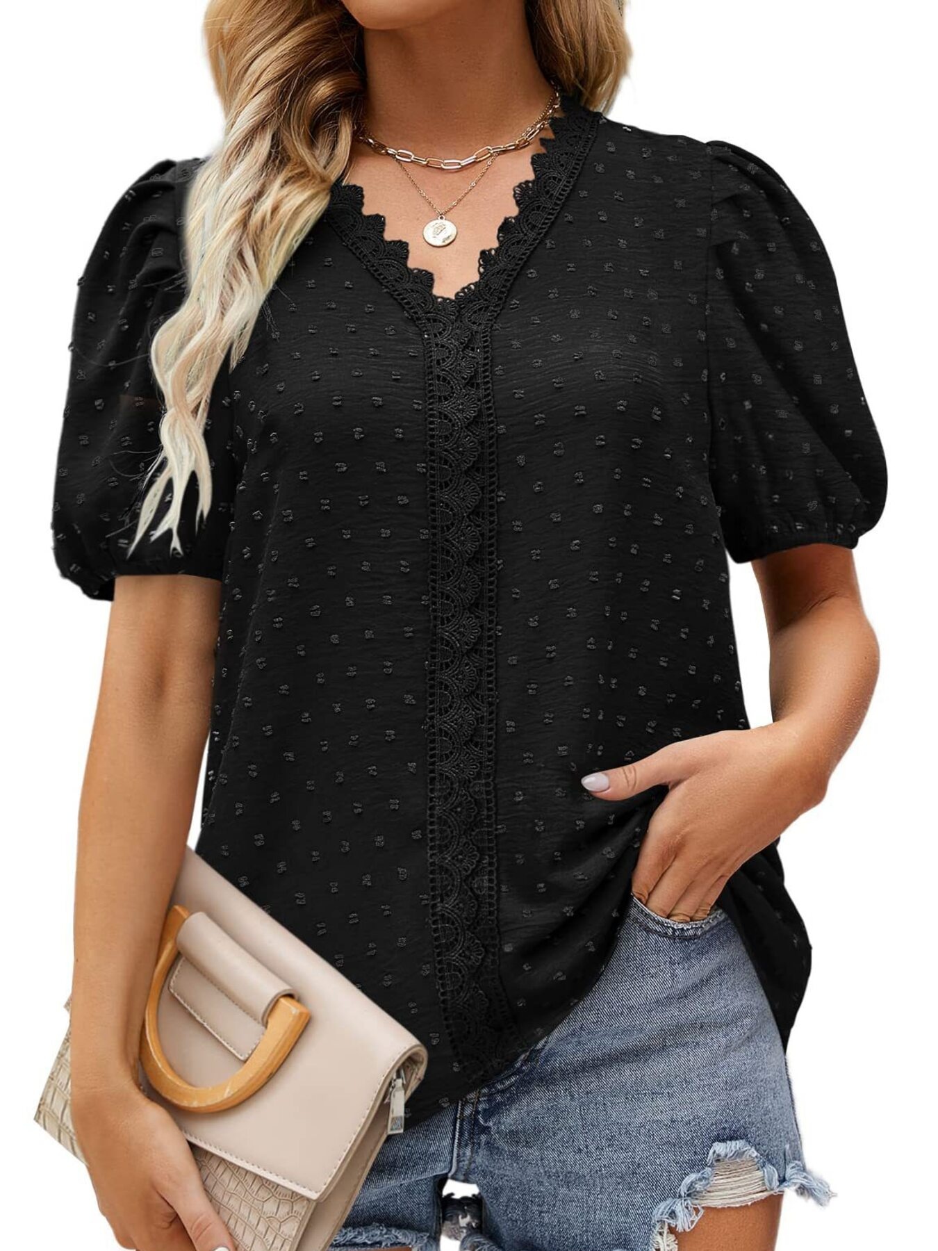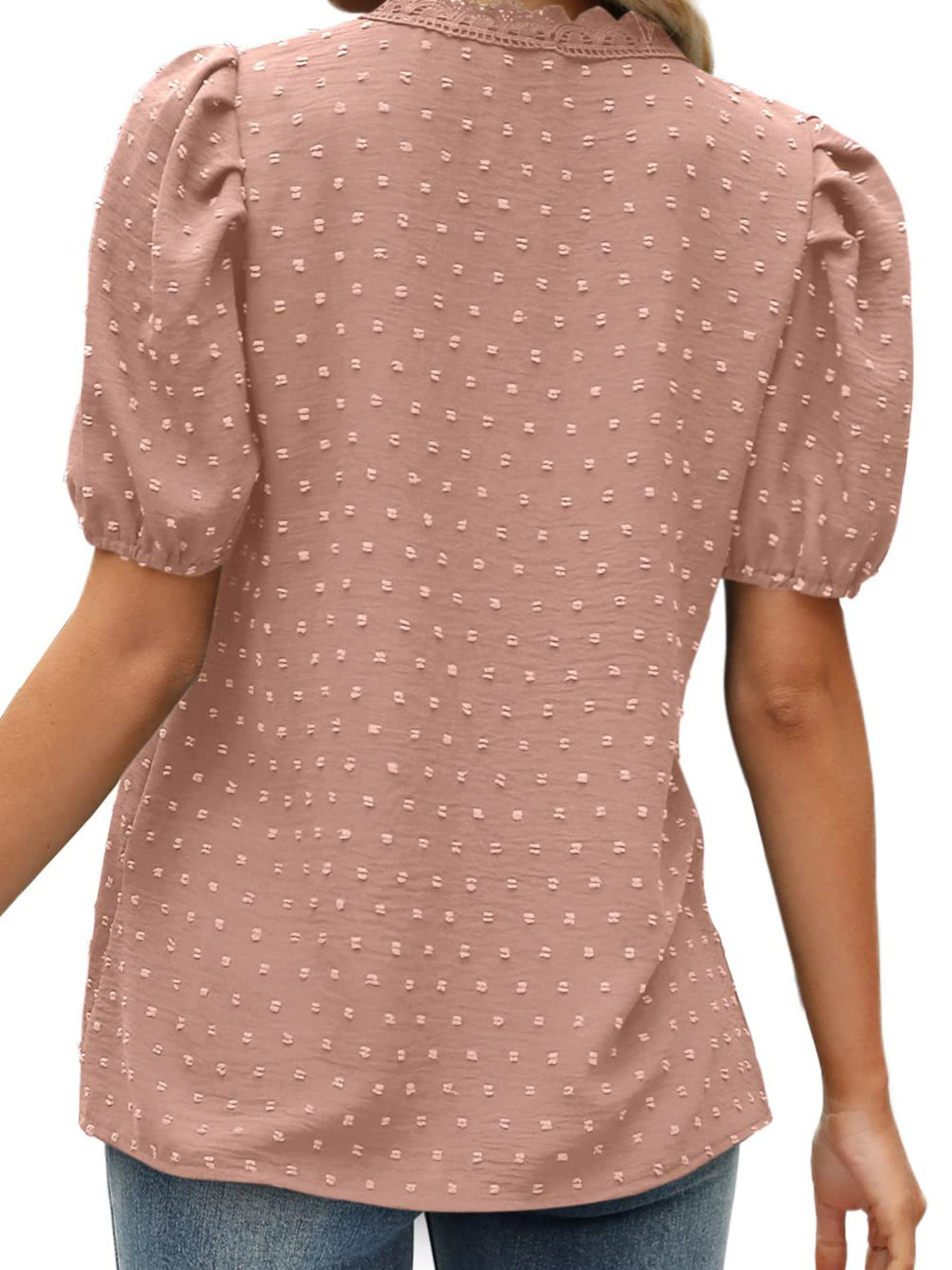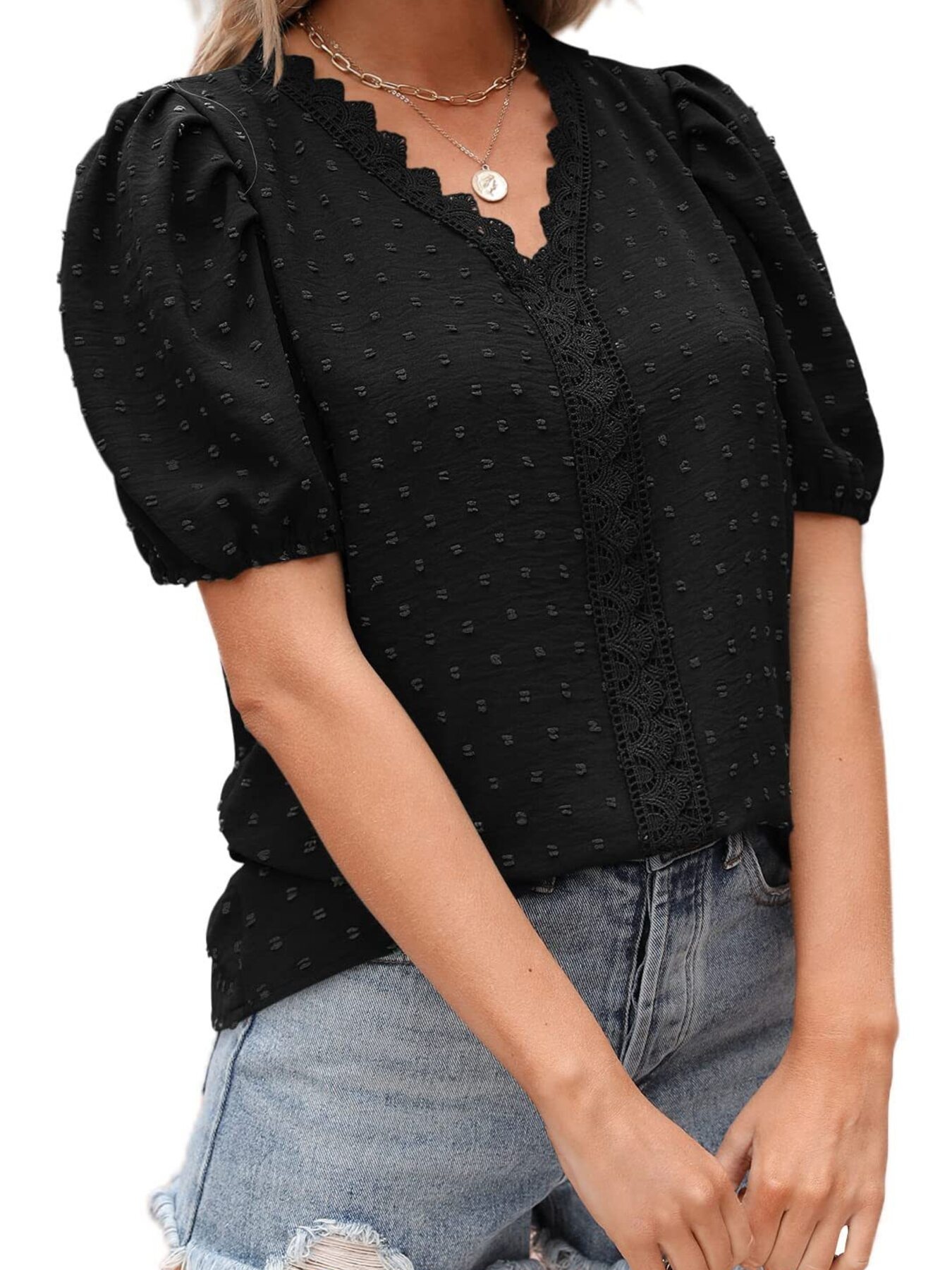 Puff Sleeve Swiss Dot Lace Trim Blouse