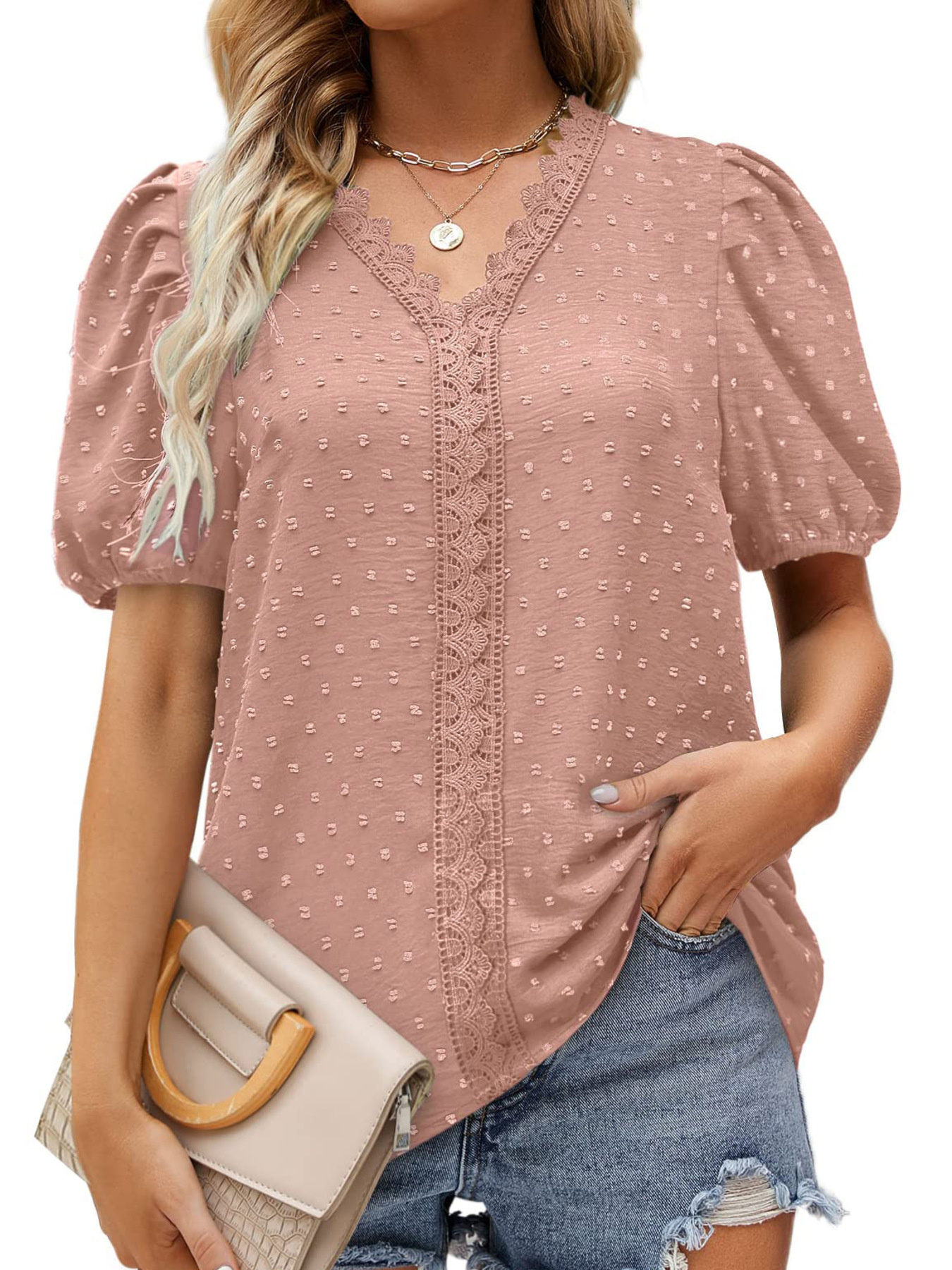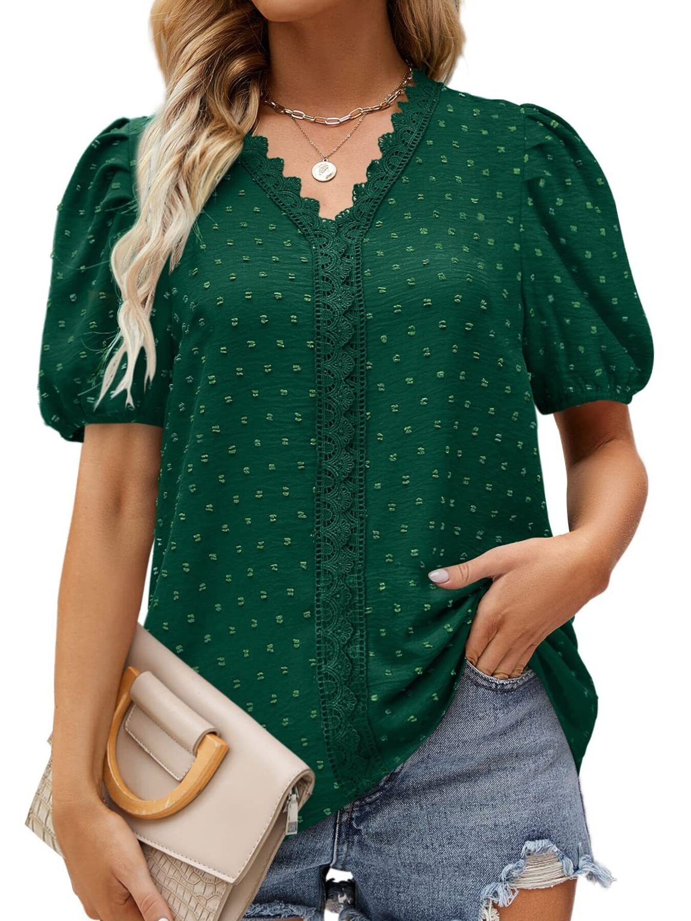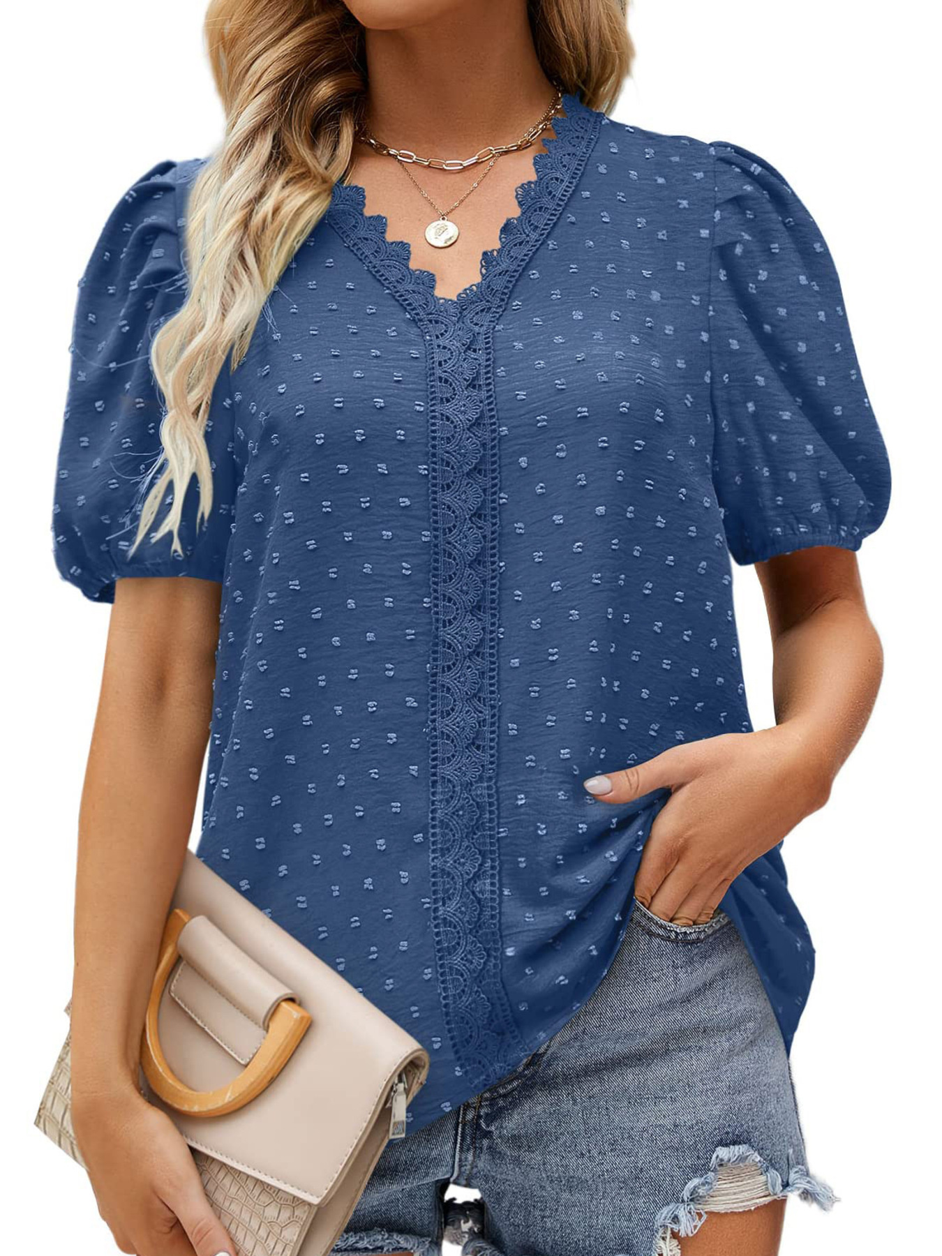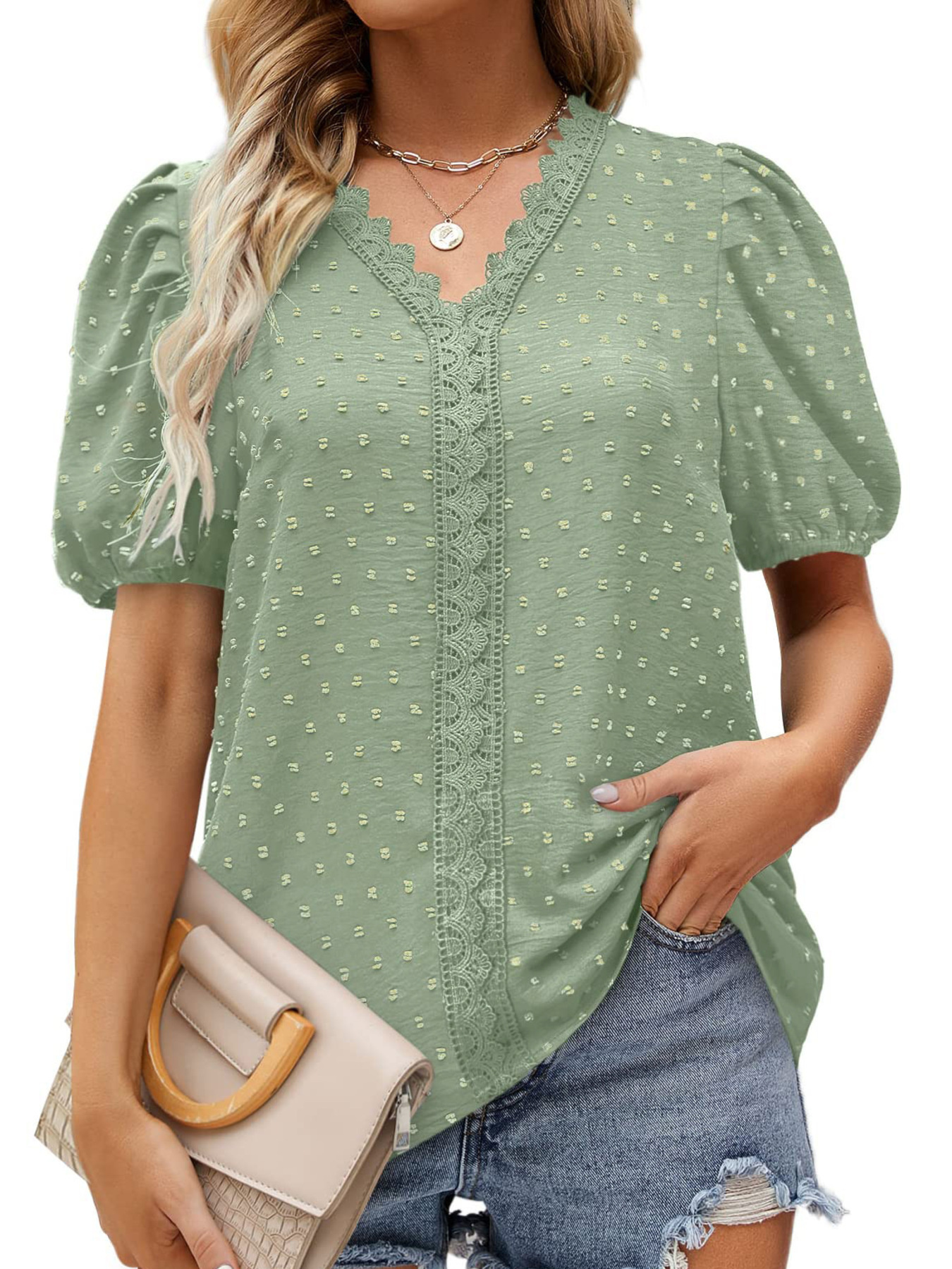 Puff Sleeve Swiss Dot Lace Trim Blouse