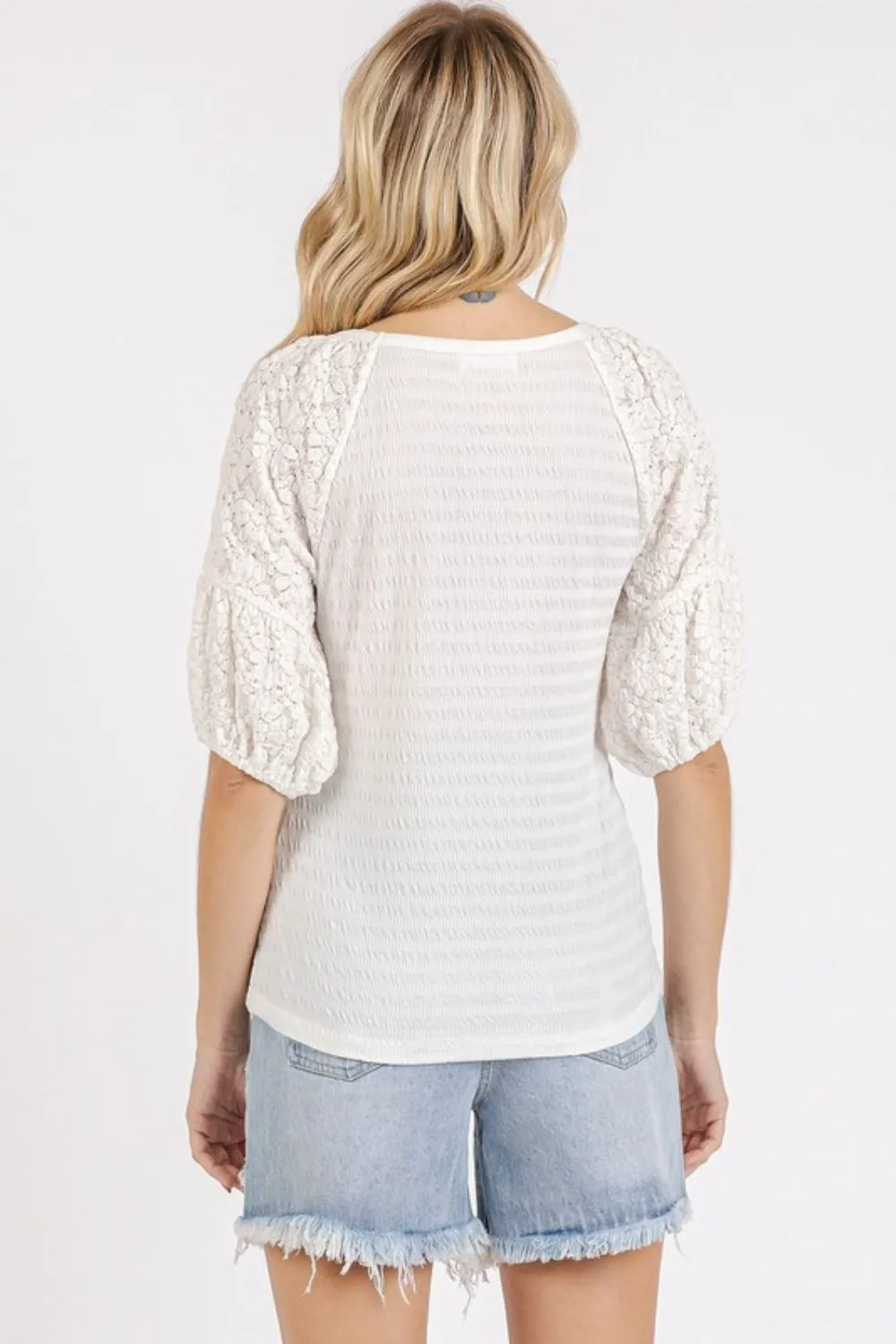 Mittoshop Mixed Media Textured Knit Popcorn Puff Sleeve Blouse