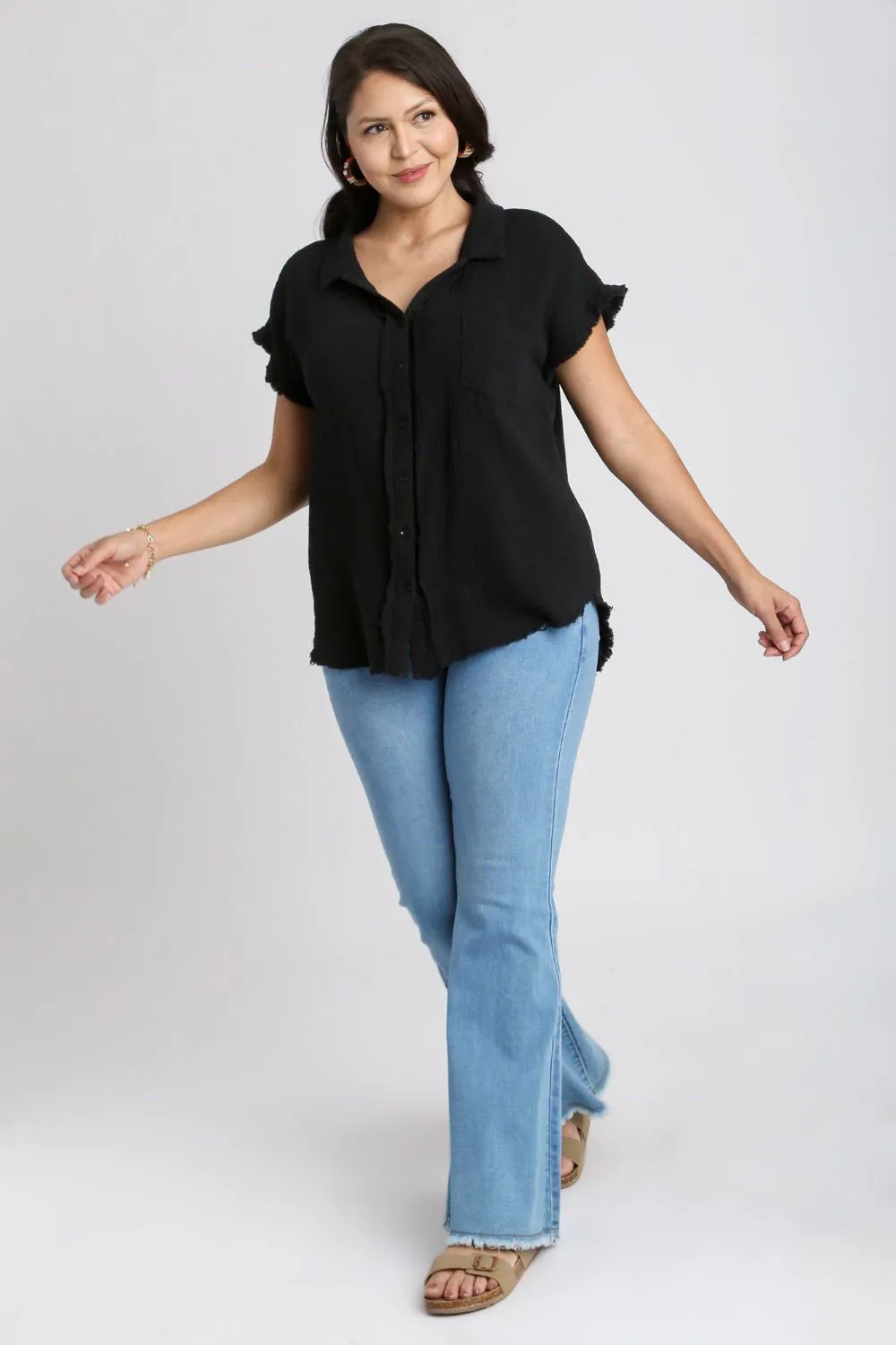 Umgee Full Size Frayed Hem Collared Neck Short Sleeve Shirt Plus Size