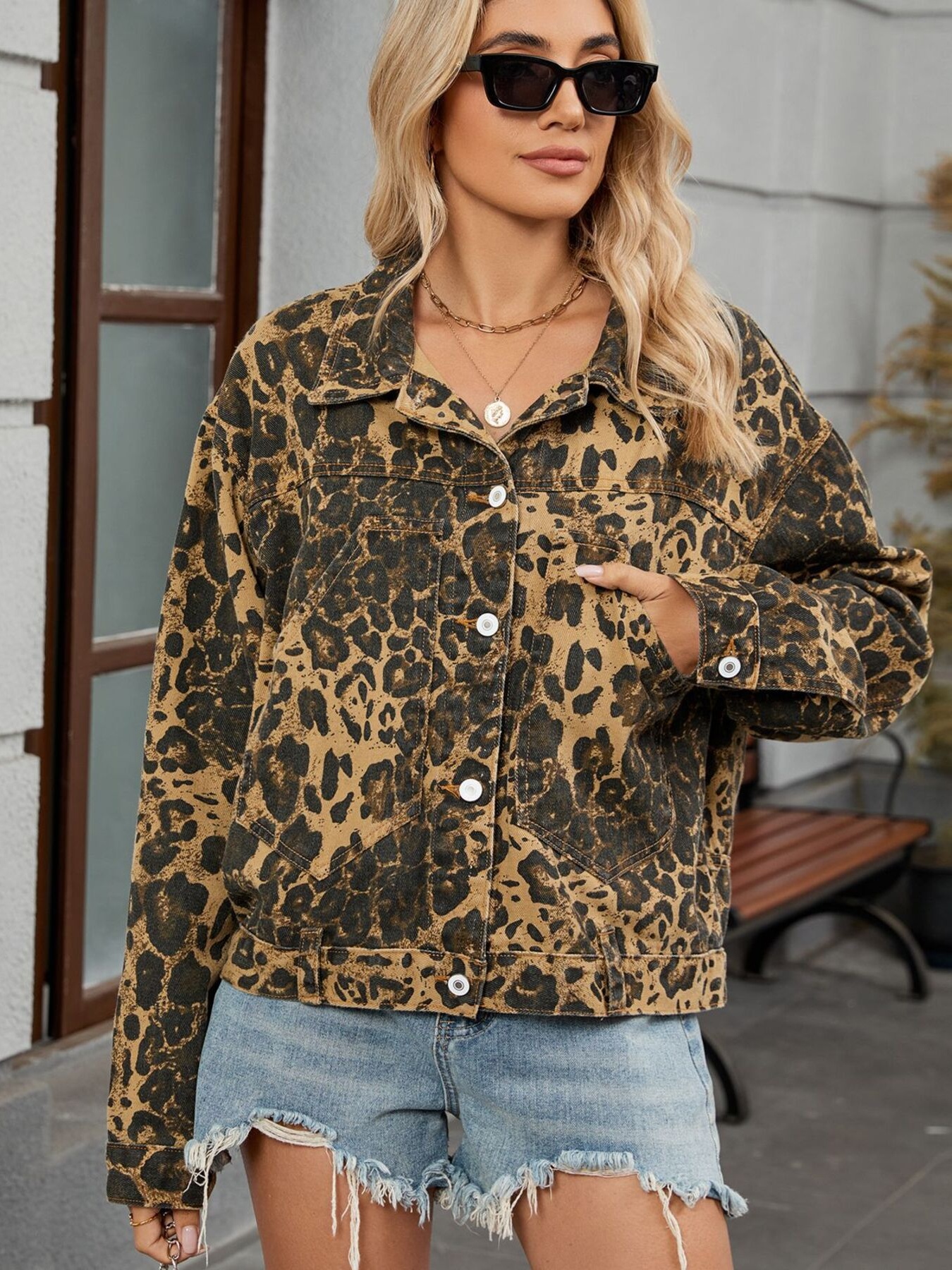 Leopard Print Button Up Denim Jacket