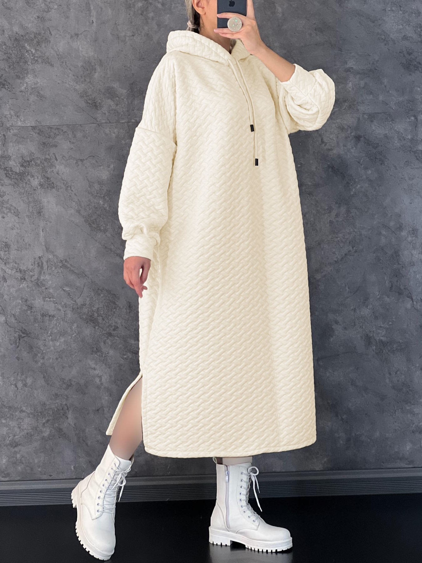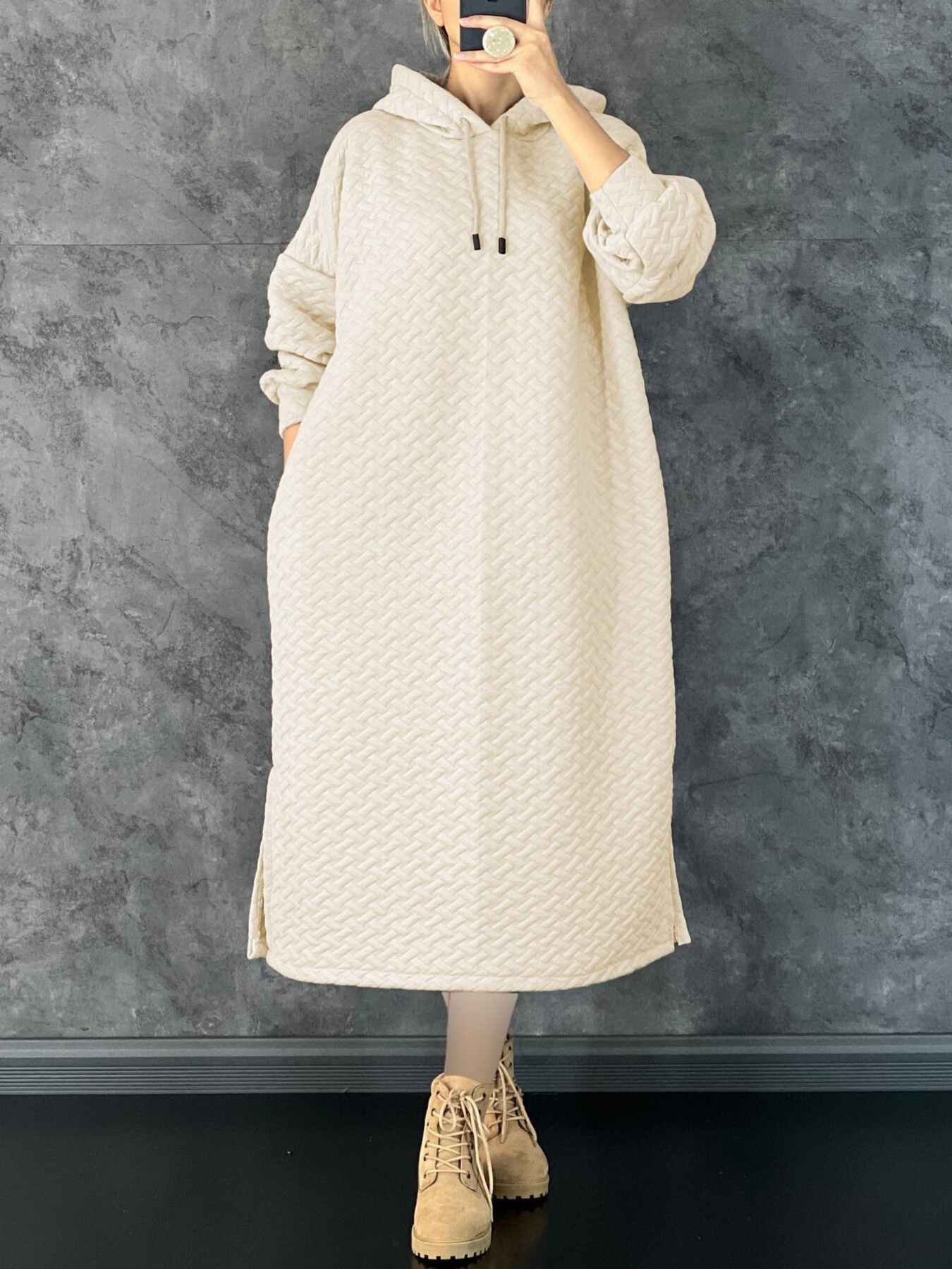 Textured Knit Hoodie Dress With Side Slit